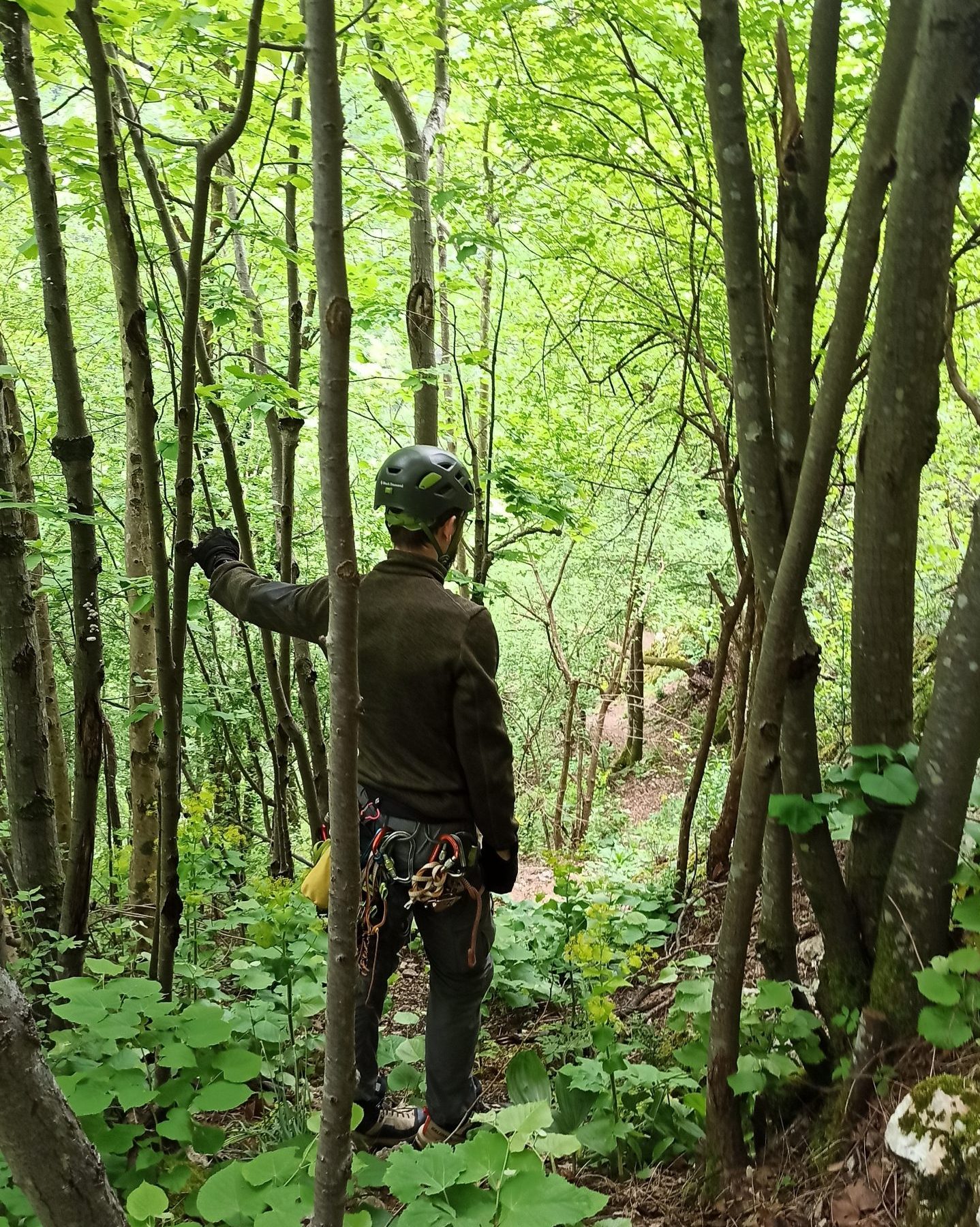 Selgus, et raja alguse leidmine oli terve multipitchi ronimise juures kõige raskem osa. Me kõndisime umbes pool tundi läbi metsa mööda järsku nõlva üles, et kalju alguseni jõuda. Kuna ma kandsin ka meie 70 meetrist köit mäest ülesse, siis virvendasid mul silme ees kaitseväe jalgsirännakud raske seljakotiga. Lõpuks aga jõudsime pärale ja saime päris ronimisega pihta hakata.